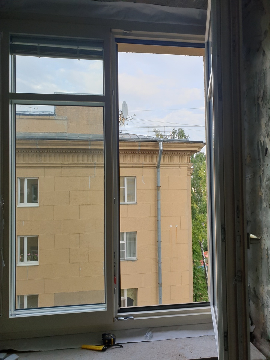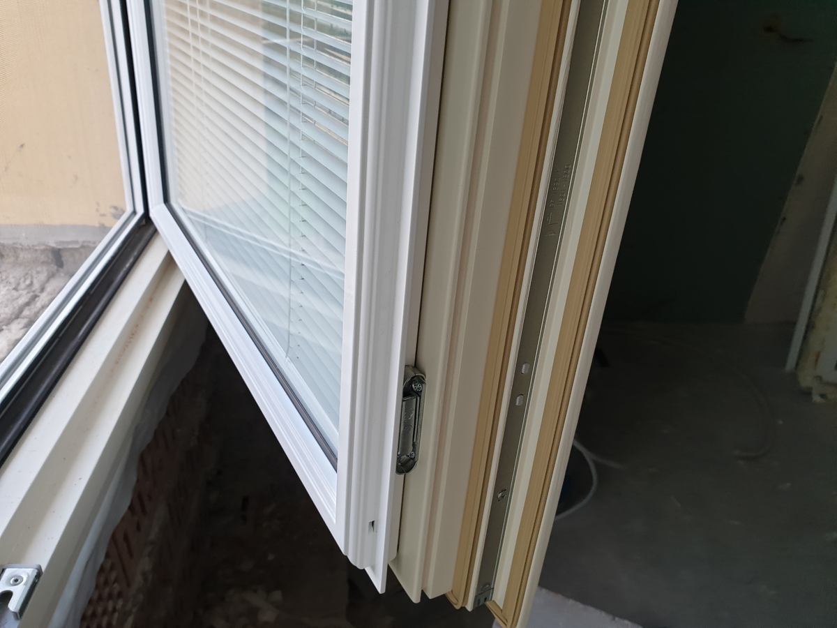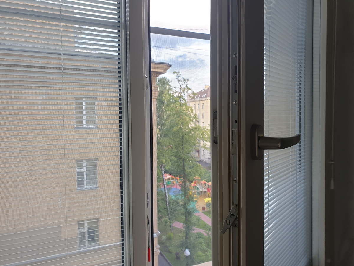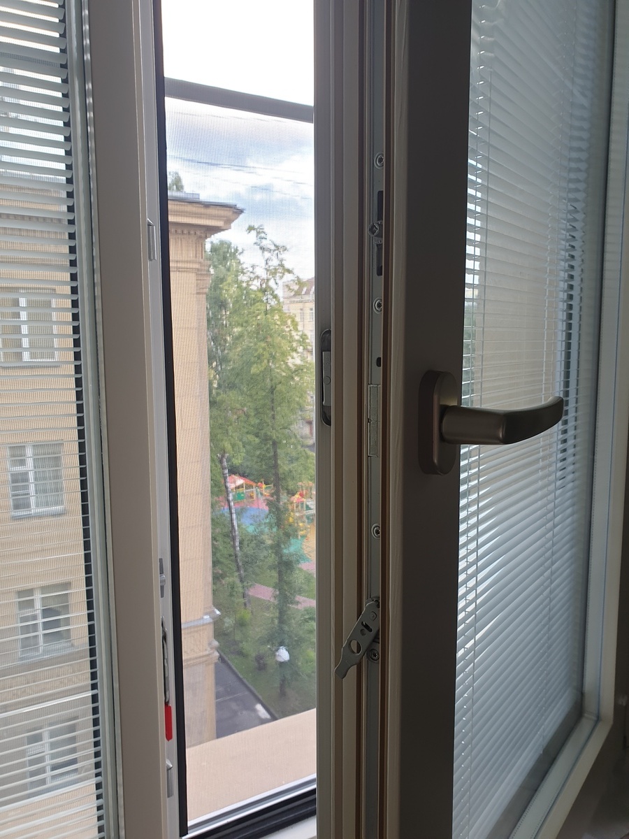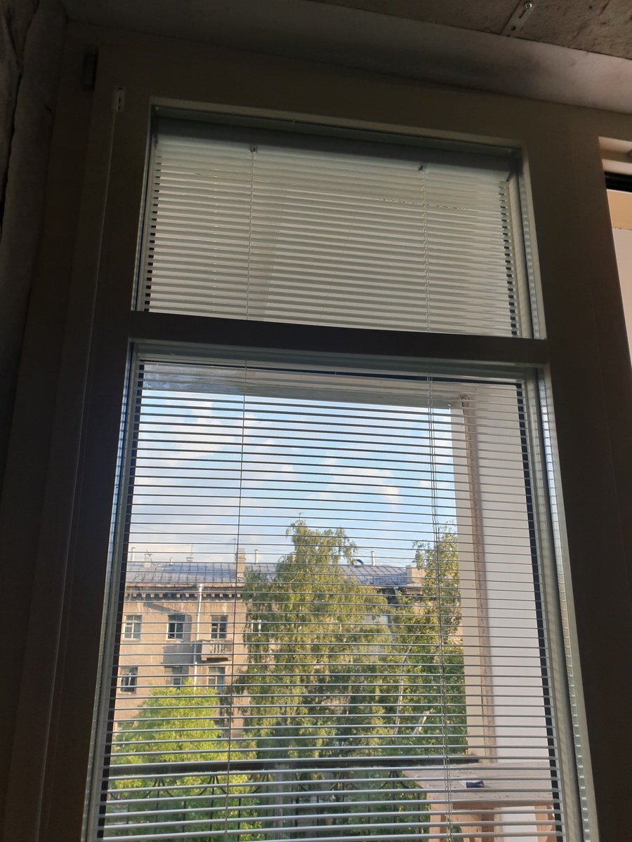 В качестве материала была выбрана сосна — древесина, которая не только экологична и долговечна, но и обладает отличными тепло- и звукоизоляционными свойствами. Особенностью этих окон стали встроенные жалюзи, расположенные между стёклами: они не требуют ухода, не собирают пыль и позволяют легко регулировать уровень света и приватности.